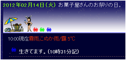 2012-02-14 お菓子屋さんのお祭りの日。_ 生きてます。(10時31分記)いつもそうなんですが最近本当に、時間が無いんですよ。 どのぐらい時間がないのかというと、先週なんか、三日間も休肝日を設けざるを得ないぐらい。それもね、『仕方なく』では無くって、酒飲むよりも楽しいことがあって、それをするために本気モードで夜更かししていました。睡眠時間三時間ぐらい。 私の場合、お酒を飲んでもできる仕事と、そうでない仕事があって、いつもは夜、自室でウイスキィ飲みながらでも仕事することが多々あるのですが、今回はチトそうもいかない。 かなり目処がついたので、先週の金曜日からまたふつーに晩酌再開しましたが。 実験ノートに書き殴られた膨大な実験データ。記憶や感触がフレッシュなウチにまとめておかないといけないのですが、この内容は近々webで発表しようと思っています。 まとめがてら、html打ちますかね。