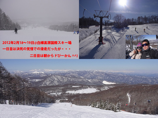 2012-02-20 腰が痛い・・・_ 毎年恒例白樺国際高原スキー場行。(15時18分記)2月18日(土)の1泊で、行ってきました。 いやぁ・・・初日は白樺国際高原スキー場とは思えない雪模様。ここ、たいがい、まさに抜けるような青空のドぴーかんなんですが・・・ しかし翌19日は、『まさにこれぞ白樺国際!』状態の快晴に! 攻めすぎたせいか、今朝起きたら、筋肉痛こそ無いですが腰が痛いです。 昔はこんなことなかったのに・・・歳だなぁ・・・ 行きは朝早く出たこともあって、自宅から調布ICまで45分ぐらいで行けたのですが、帰りは夕方だってこともあって、調布ICから自宅まで2時間もかかってしまった。 なにかよいルートを考えなければですね。
