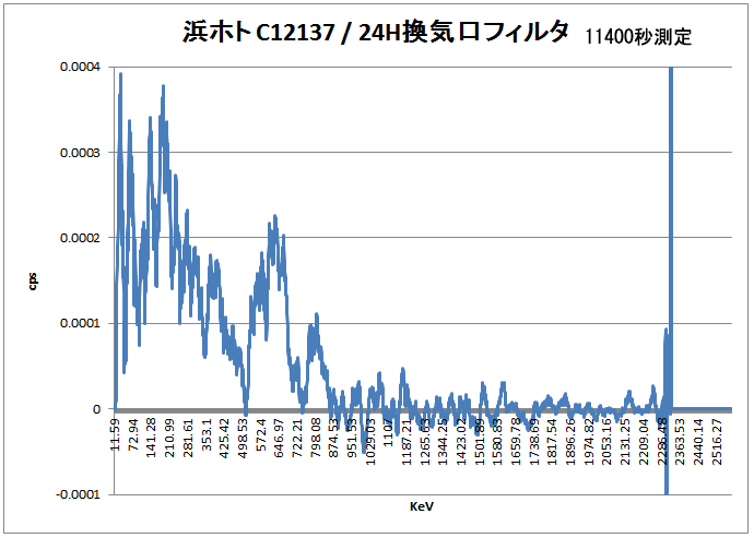 2012-05-16 初夏の兆し?!_ 自作線量計で食材の放射性物質がどこまで検出出来るかの考察。(10時26分記)こう、さくっと「大人が食べても大丈夫かどうか?」ぐらいが判別できそうな食材の放射能測定器が簡単にできないものかとあーだこーだ、やっていたのですが、今のところの中間報告をまとめてみました。こちらのリンクから、ぞうぞ。 現在、検体量が 500g あれば、30 Bq/Kg ぐらいの放射性セシウムは見えるかな〜って、感じ。 あと 6dB は、観測限界下げたいです。 _ 浜ホト放射線検出器モジュール「C12137」のパワー。(10時40分記)先日納品された浜ホトC12137で、例の24時間換気口フィルタを測ってみました。 11400秒の測定で、137Csと134Csが完全に分離して検知できています。 同じ検体をATOMTEX社製ベクレルモニタAT1320Aで測ったときのスペクトルは、こちらで紹介しています。ご興味あればぜひ見比べてください。 さすが本職さんは違うなぁ・・・ これ使えば、鉛簡易遮蔽容器で検体量 250g でも、おそらく 10 Bq/Kg は見えると思うのですが、いかんせん、モジュール部だけで消費税込み 26万2千5百円(但しサンプル価格)というのは、ちょっと庶民的とは言い難い値段です。 一方、上で紹介しました自作線量計は、部品代6千円+ケース代(紅茶の空き缶使ったのでタダ)と、かなり庶民的。でも、検体量 250g だと現状 60 Bq/Kg が精一杯かなぁって感じ。 さらなる研究を、続けます。