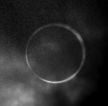 オリンパスE-P1 Canon SERENAR 100mm f:4 IR88 赤外ゼラチンフィルタ こんな感じです。 雲の薄ーいところから、ときたま顔を出す太陽。金環状態のときにめいっぱい濃い雲が来たので「リングは見えないかな?」と思ったのですが、濃いなかにも少し薄いところがあり、「ちらっ」と見えた隙に撮影成功です。 なんとかリングに見えてます。 隣で日食グラス越しに見ていた娘は、「ぼんやりだけど見えた!」と。 可視光よりはシャープに写ったのではないかと、思います。 ISO200で1/5の撮影。等倍トリミングです。 赤外線なので、現像はdcrawで12bitベイヤーRaw化して、自作ソフトでRBをGに合わせてグレイスケール化し、フォトショップでヒストグラムとガンマ調整です。 最大食になる午前7時半前、なんだか急に冷たい風が吹いてきて、寒気を感じました。日食のときって、ほんとうに気温が下がるんですね。 次回の金環日食は、2030年6月1日に北海道で、皆既日食は、2035年9月2日に中部・関東の一部で、見られるそうです。 それまで生きてるかな。微妙だな〜 ^^)