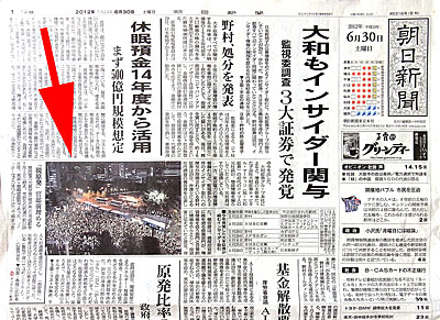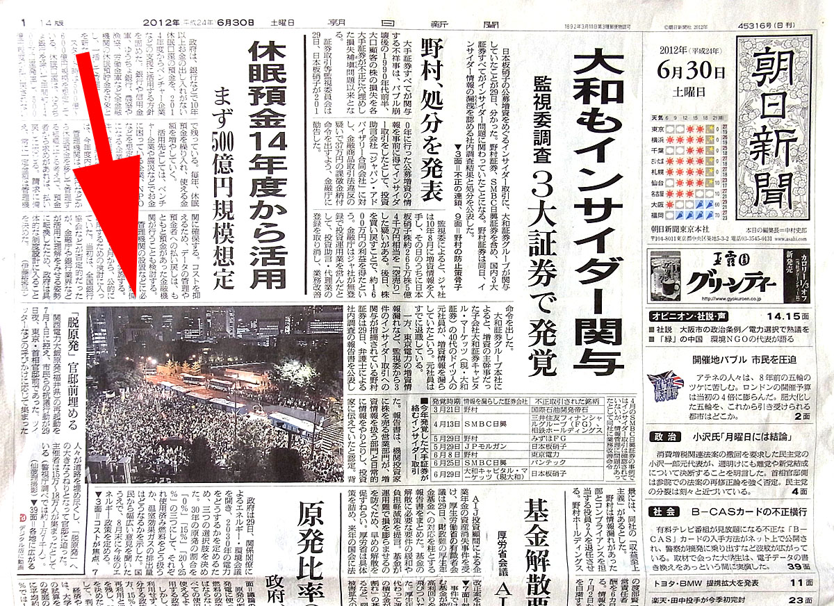 2012-06-30 大きなときの流れの転換点。_ 大飯原発再稼働反対首相官邸前デモ。(12時24分記)毎週金曜日の夕方から行われている原発再稼働反対首相官邸前デモ。 先週ようやくテレビニュースでも取り上げられましたが、今週のそれは先週をさらに上回るパワーだったようで、主催者発表では前回の4万5千人を大きく上回る、15万〜18万人だったとのことです。警視庁調べの約1万7千人とは数値に大きなかい離があって、どっちが真実に近いのかわかりませんが、とにかくすさまじい人たちが集まり、声を上げていることは事実です。 東京新聞では今朝の朝刊トップで大々的に報じられているようです。やってくれますね東京新聞。ウチは朝日新聞なのですが、それでもトップ頁に大き目なリード記事があり、社会面で比較的丁寧に報道されています。 ・・・・・ 私は去年、どんな圧力、利権、工作があろうとも、「日本の原発はやがて止まる」「この流れは止められない」と、ここで書きました。 多くの日本国民は、本気で気が付いたのです。 私も、2011年3月11日までは、よく理解もせずに原発安全神話を受け入れていました。詳細に調べもせず、勉強もせず、ただ、なんとなく、原発安全神話を受け入れていたのです。 それが脆くも崩れ去った。 原発の安全性は、科学で担保されたものではなく、科学とは全く無縁な、まるで別の力により、根拠なく安全だと決めつけられていただけだったのです。 それに気が付いた当時、私は自分の浅はかさ、愚かさを大いに反省し、悔やみ、情けなくなり、涙したものです。 調べれば調べるほど、まんまと騙されていた自分の馬鹿さが、痛いほど胸に突き刺さる。 でも、遅かりしであっても気が付けただけよかったです。 過去の愚かな自分を悔いる気持ちは一生背負っていくつもり。仕方ないです。でも、明日の日本を支える子どもたちのため、美しい日本を実現するために、出来ることをやって行きたい。 今からでも遅くない。気が付けただけよかった。 デモには参加できなかったけど、昨晩自室で、その様子を伝える可視化されたバイナリデータを見ながら、改めて自分を再確認しました。 今こそ大きな時代の転換点なのだと思うのです。 これは、原発だけにとどまらない、大きなうねりなのだと、身体でひしひしと、感じます。 [ツッコミを入れる]