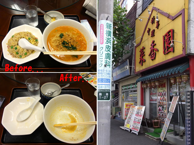 〆て700円。あれ〜、昔はもっと安かったような・・・ま、いっか。 ・・・・・ さて翌日(すなわち昨日10/8(日))。 ・・・・・ 久しぶりに元祖ニュータンタンメン本舗の「タンタンメン」との再会を果たしは私は、綱島店の味が綱島店の味なのか、それとも、28年間ぐらいの歳月とともに、「タンタンメン」自体の味が変幻したのかを知りたくなり、ここは別店舗でも食べてみなければ・・・ というわけで、綱島店についでウチの近所にある駒岡店に行くことにしました。「タンタンメン」連荘です。 ところが・・・10/8(日)の午後1時ごろ駒岡店に着くと、暗い店内で店のおっちゃんが仕込みしているではありませんか。「あり?」と思い、「すいませ〜ん、今日はやってないんですかぁ〜〜〜?」。 『お客さん、ウチは夕方からなんですよ・・・』 が〜〜〜ん・・・ 仕方がないので、少し先に見つけた中華料理「菜香園」さんで、「担担麺と半炒飯セット」を食べて帰りました。