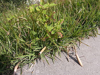 カマキリのオスはメスに比べてびびりが多いので、背中をそっと叩くと速攻で逃げて行きます。メスは、手を出すと乗ってきたりするほど度胸あるんですけどね ^^) 自転車に敷かれたら可哀想なので、脇の草むらに誘導します。