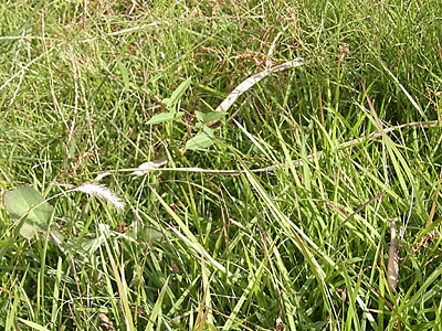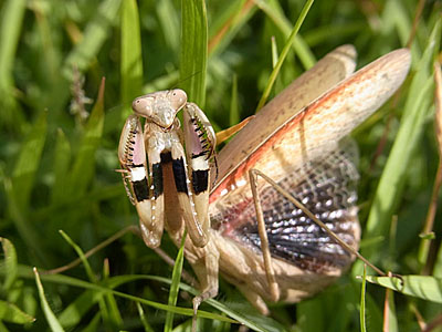草むらに入った途端振り返って、ポーズを決めてくれました。 これ、「逃がしてくれてありがとう!」ってお礼を言っているわけではなく、私を敵とみなして威嚇しているんですね。コカマキリの特徴です。 「わかったわかった。はよ行け!」と、もっと奥に行くようせかせる私 ^^)