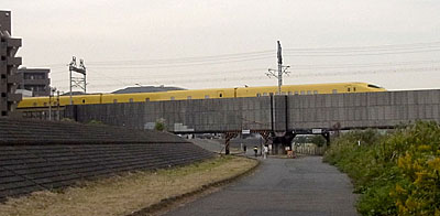草むらの中に紛れていきました。 どこに居るか、わかるかな? 虫ではありませんが少々珍しいものを。 カメムシ撮影中に、いつもとは違う聞きなれない新幹線走行音に顔を上げると、ドクターイエローが走ってました。 速攻でカメラを向けてフォーカシングするも、マクロモードがオンなのでAF合焦に時間がかかります。なんとかギリギリ、フレームアウト直前にドクターイエロー補足できました ^^) 撮影時刻は12時02分頃@鶴見川鉄橋下り線・・・です。 なかなか見ることができないとのことですが、私はかれこれ十回以上は目撃していると思います。新幹線で移動中にすれ違ったり、どこかの(こだましか停まらない)駅に停まっているのを追い抜きざまに見たり、慶応日吉の山の上を散歩していたら、走っているのを見たり・・・と。 この鶴見川にかかる鉄橋でも、数回は見たと思います。