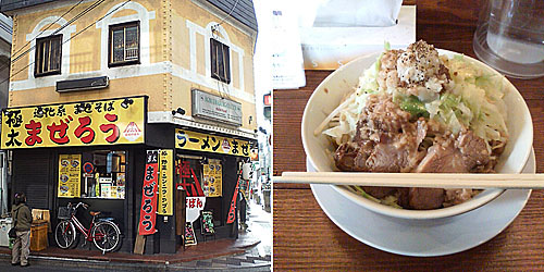 _ 綱島駅前「ばばん」の まぜろう。(17時25分記)今日のお昼ご飯は、綱島駅前の ばばん というラーメン屋さんで、まぜろう という混ぜ蕎麦?を食べました。 揚州商人のあるほうのバス通りの角にあるお店(って、地元民にしか通じないか ^^))です。 ここ、以前は別のラーメン屋さんだったと思うのだけど、なんだったかなぁ・・・入ったことないので覚えてません。 で、ここも初挑戦だったのですが、まぜろう ってどんなもんかわからずに注文。予想を遥かに超える破壊力にしばし唖然。すごい量です。 実は今日、先日はじめて食べた もりの中華そば を再訪しようと思って午後1時すぎに行って見るも8人ぐらい並んでいて直ちにスルー判断。かなりお腹が空いていたので まぜろう大盛 にしようかと思ったのですが、初めての店だったので念のために標準品をオーダー。大盛にしないで本当によかったです。 見た感じよくわかりませんが、かなり立派な焼豚が3片と、キャベツもやしのてんこ盛り。頂上に君臨するのはニンニクと他に何か?です。下に、超極太のしっかりした麺があります。スープは油そばみたいな感じのものが少量(麺が少し浸かっている程度)入っていて、これをぐにぐに混ぜて食べます。 味は濃厚しっかりしていて、でも、喉が渇くという感じのものでは無いです。美味しいです。 朝御飯と晩御飯をヘルシーメニューに調整した上で、再訪したいです ^^) 〆て 780円也。ごちそうさまでした。
