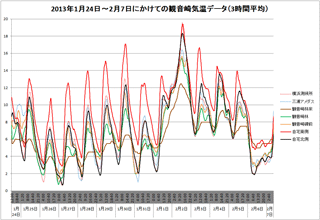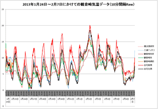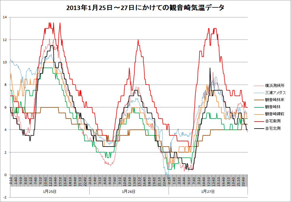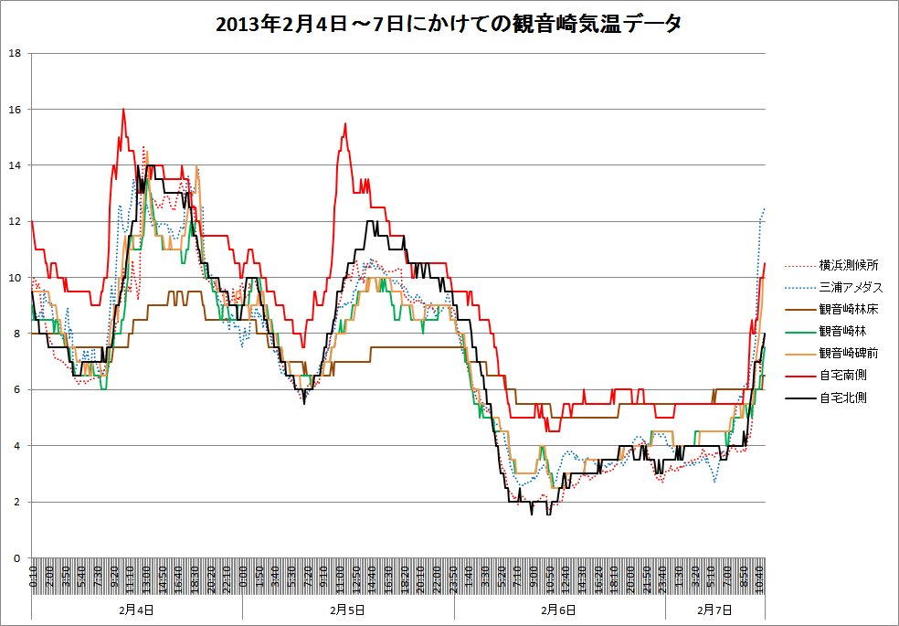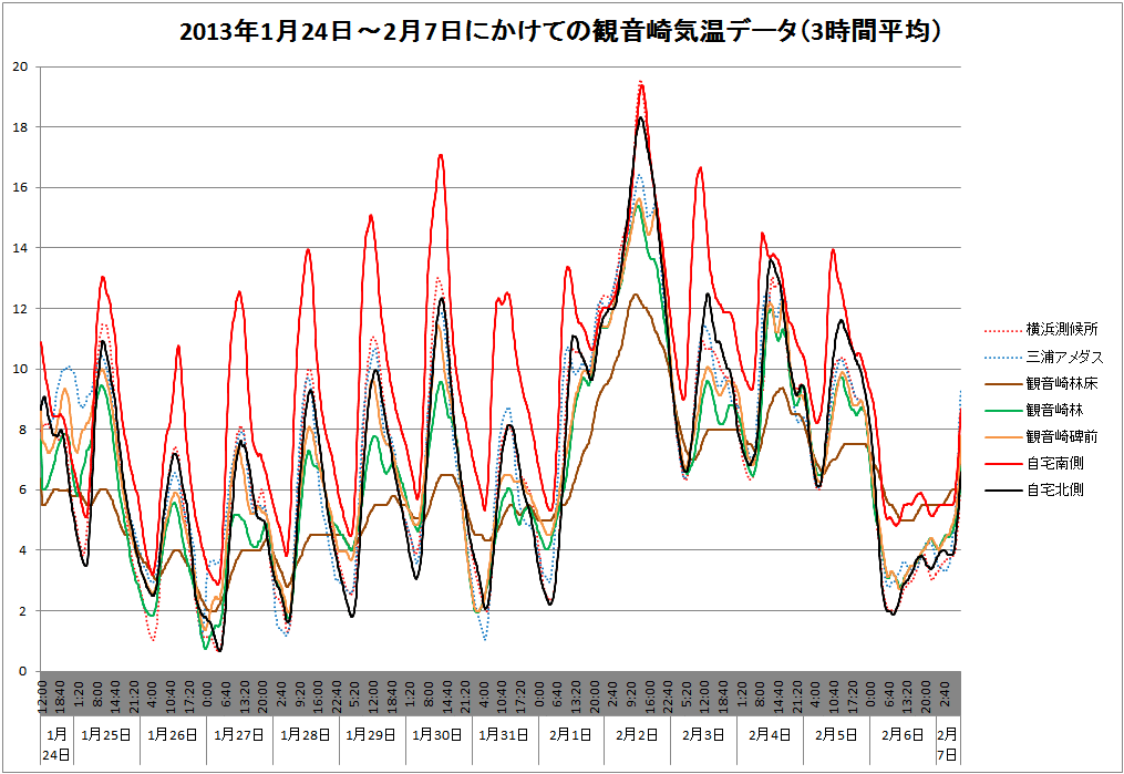 上のグラフが全期間の測定結果。グラフのサムネイルをクリックすると、デカいグラフを表示します。横浜気象台と、三浦アメダス、横浜市港北区内にある自宅(マンション10階)の南側、北側ベランダでそれぞれ測定した温度データも、合わせてプロットしております。 左側が10分間隔サンプリングのRawデータですが、ぐちゃぐちゃでちょっと見にくいので、これを3時間平均したものが、右のグラフです。 特徴的な期間を抽出して、別グラフにしてみました。2月6日は、横浜界隈でも午前中に降雪があり、日中の気温上昇がほとんど無かった日です。