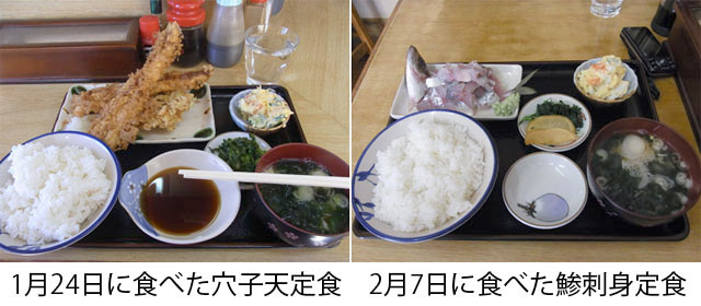 1月12日(土)にはじめて入って大変に気に入りました味美食堂。温度計を仕掛けた1月24日(木)と、2月7日(木)にも続けて再訪し、 今のところ食べた定食三種(アジフライ定食、穴子天定食、アジ刺身定食)はハズれ全く無しですね。どれも実に美味い。穴子天のサクサクでジューシー具合なんか絶品だし、アジの刺身もフレッシュで肉厚で本当に美味い。また、御味噌汁のわかめがこれまた本当に美味いんです。このわかめ、走水で採れるわかめなのかなぁ。道中歩いていると、わかめを干している光景をよく見かけます。