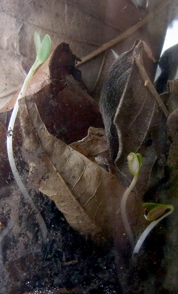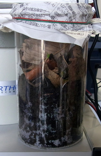 2013-02-25 居座る寒波。_ 三寒四寒?(16時05分記)2月も25日だというのに、なんだか寒い毎日です。今週水曜日ぐらいから、暖かくなるという話ですが、我が仕事部屋には、一足先に春がやってきているところがあります。 この写真は、先日2/10に観音崎にヒナカマキリに関連した調査に行った際に、採取してきた観音崎の土です。(観音崎はどのぐらい暖かいのか?) ちょうど、ヒナカマキリの卵のうが見つかったあたりの、落ち葉床から少々お借りしてきました。 ヒナカマキリは、地上性のカマキリで、卵のうから産まれた幼虫は1mmにも満たないごく小さい大きさ。こんな小さい幼虫が、産まれて直後いったいなにを食べているのか調べるために、産まれて直後に生活を開始する土壌環境を、調べてみようと思って小瓶に採取してきました。 卵のうは孵化されると困るので、屋外の日の当たらない場所においてあるのですが、この採取土壌は、私の仕事部屋においてあります。真冬でも昼間は暖房を入れない我が仕事部屋とはいえ、窓を閉めれば屋外よりは幾分暖かくなります。15時現在で、室温14.2度。屋外+6度ぐらいな感じでしょうか。 というわけで、おそらく、一足先に春が来たと勘違いしたのでしょう。小瓶の中は、もう春です ^^) なにかの種が発芽して新芽が出ていたり、よ〜〜〜くみると、落ち葉の裏で小さいトビムシのようなもの、土の上でダニみたいな虫? 線虫のようなものが、たくさん動いています。 こういう、豊かで潤った土壌、生物層の中で、産まれたばかりのヒナカマキリの幼虫たちは、思い思いに食べられるものを見つけては、捕食しているのでしょう。 当初、自分で土を用意して、そこに、この観音崎土壌から分離した微小生物を移し替えて、新規にヒナカマキリ幼虫の生育環境を整えようかと思っていたのですが、この豊潤な生物層を見てしまうと、そんな簡単なものではどうもダメそうです。 もう一度観音崎に行って、もう少し土壌をお借りしてこようかと、思案中です。もうね、変な小細工しないで、この土壌のまま、育てたほうがよさそうな感じです。