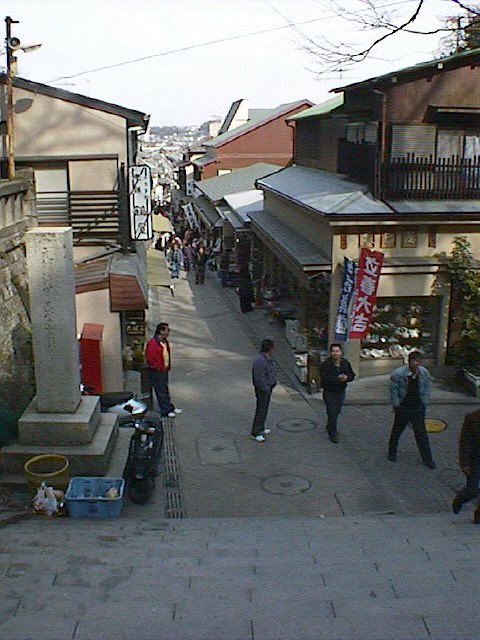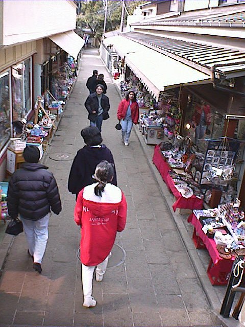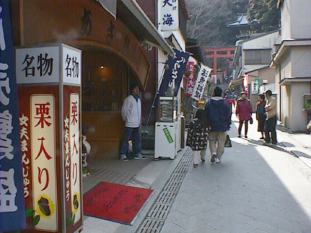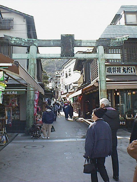 いわゆる江ノ島正面側から、山を登って江ノ島の反対側、岩屋側に出るためのコースの起点である青銅の鳥居。オリジナルは1747年に建てられるが、現存のものは、その後再建されたものである。ここからのんびり散策がてら、途中エスカーという有料エスカレーターを経由すれば約30分程度で頂上までゆっくり到着できる。おみやげ屋さんや、海の幸豊富な食事処もあちらこちらにあり、呼び込みの声もにぎやかでいい感じ。