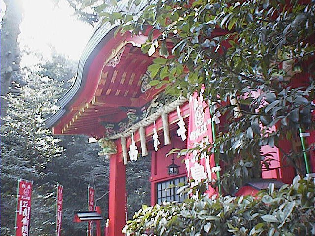鳥居の奥に見える黒褐色の屋根が江島神社。江島神社というのは島内にある3つの宮=辺津宮、中津宮、奥津宮の総称であり、それぞれの宮には海の守護神の女神が祀られている。