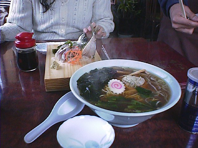 島ラーメン(¥800X2人分)と、あじのたたき(¥1000)を食べる。シンプルな味でうまい。しかし、私が大学時代に喰った頃の島ラーメンは、確か450円ぐらいで、もっと中身が見えないぐらいにわかめだのなんだのがのっかっていて、思いきり磯の香りがしたような気が・・・・