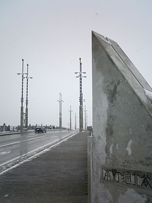 さくっと食べ終えて、せっかくだからこの雪の中、日本海まで歩くことにする。途中、ずいぶん洒落たデザインの橋が。ここだけ見たら、「これどこの欧州?」って感じである。