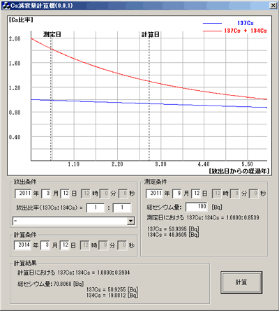 測定結果を持っていなくて、たんに、任意の日時での 137Cs と 134Cs 濃度を計算したい時には、測定条件日時を放出条件と同じ日に設定し、総セシウム量を適当に 100 [Bq] とか入れておけば、それで計算できます。